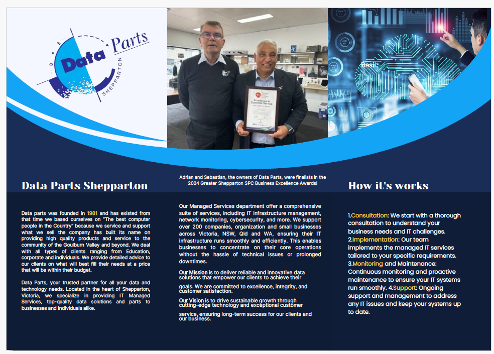 We have been selected to redesign Data Parts Shepparton website, in Victoria, Australia. We also, design a new brochure and flyer for the company as well as running a weekly FB marketing.